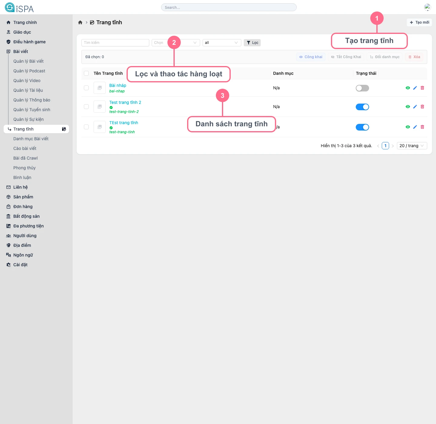 Illustration captured from the local environment on March 14, 2026. The list currently includes sample static pages so you can see how filtering, status toggling, and quick actions are meant to work.