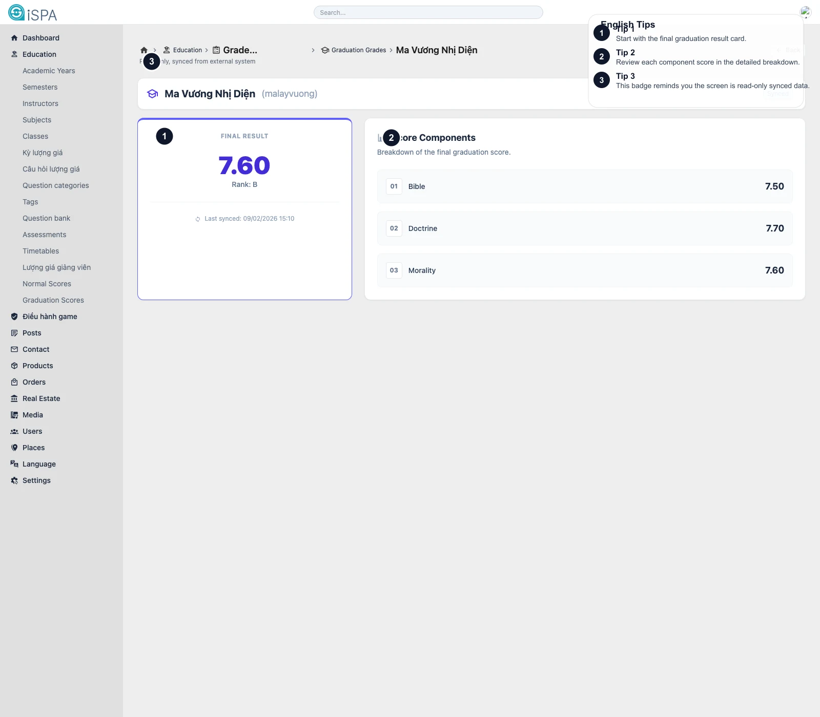 Use this page to look up graduation score summaries for each student. Like normal scores, this is mainly a synced lookup and reporting screen.
