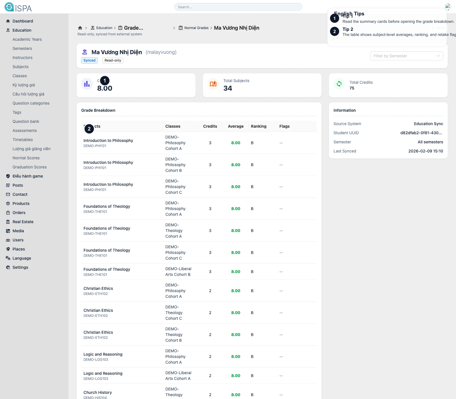 This detail route is the right place when you need the full picture of one student’s academic record inside the synced scope.
