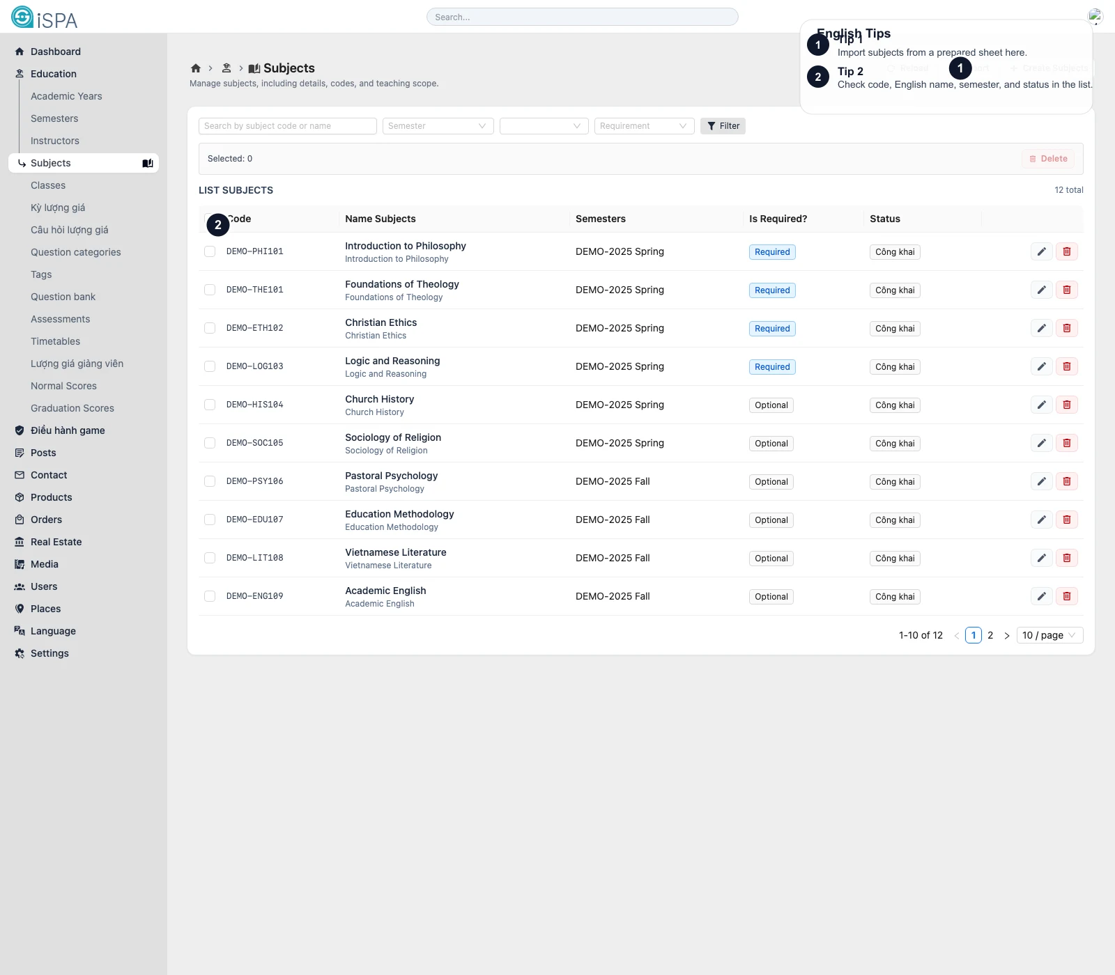 Illustration captured from the local environment on March 14, 2026. The English callouts point to the import action, filter bar, and subject table so you can understand the main layout at a glance.